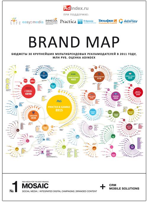На карте Brand Map представлены 30 крупнейших мультибрендовых рекламодателей с детализацией по торговым маркам и бюджетам на медиаразмещение в 2011 году.