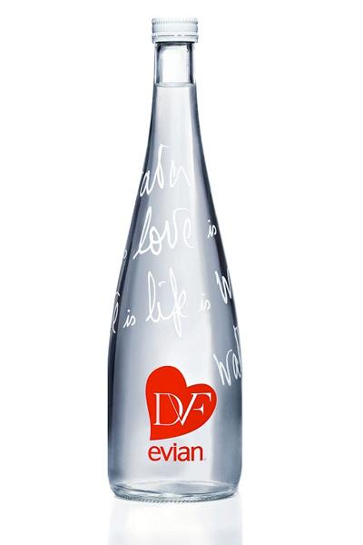 Диана фон Фюрстенберг стала первым американским дизайнером и первой женщиной, которая создала дизайн бутылки evian, расписав ее на свой вкус – бутылку опоясывает мантра, выполненная от руки «Water is Life is Love is Life is Water is...», а ярким акцентом является алое сердце (логотип бренда DVF), оттенок которого был специально создан для сотрудничества с evian. Материалы и компоненты, из которых изготовлена бутылка, полностью экологичны. Принт выполнен органическими чернилами, а стеклянная бутылка пригодна для вторичного использования и запечатана новой винтовой крышкой.