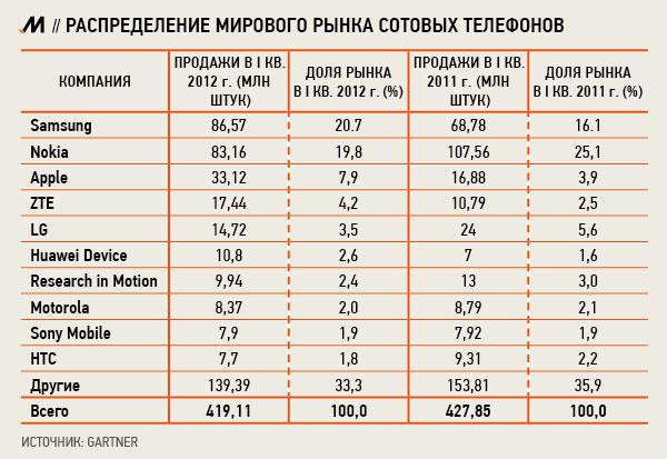 По итогам I квартала 2012 года финская компания Nokia потеряла первое место в мире по объему продаж сотовых телефонов ― впервые с 1998 года. Ее оттеснила на второе место корейская Samsung, которая теперь лидирует в мире с долей рынка сотовых телефонов 20,7% против 19,8% у Nokia