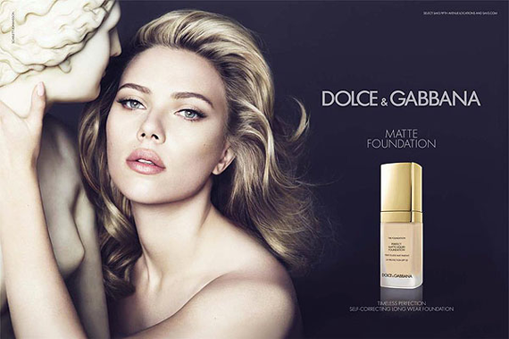 Очередная реклама — Скарлетт в образе обнаженной классической скульптуры. Ее совершенные формы призвано подчеркнуть новое тональное средство.