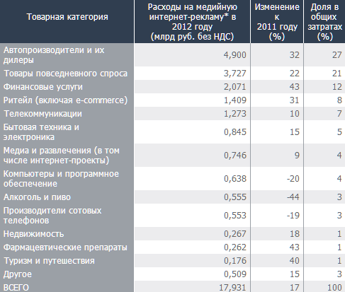 'Ъ' публикует рейтинги крупнейших покупателей медийной интернет-рекламы (баннеры, всплывающие окна и другие форматы) с 2008 года. Изначально эти подсчеты каждые полгода производило агентство MindShare Interaction. После того как в этой компании произошел конфликт учредителей, один раз (по итогам 2011 года) подобный топ подготовило агентство Havas Digital. За девять месяцев 2012 года первую десятку для 'Ъ' составляло уже входящее в группу Aegis Media агентство Vizeum Digital. Все эти рейтинги от разных авторов объединяло доминирование автопроизводителей и операторов связи.