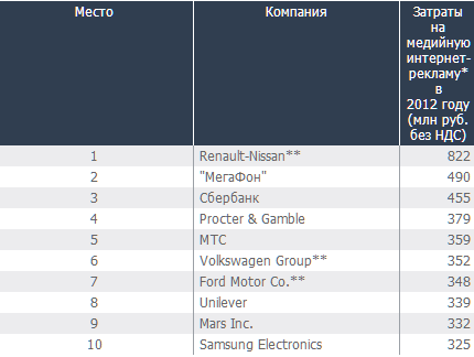 В топ-10 по итогам всего 2012 года, вновь составленном Vizeum Digital, по-прежнему присутствуют три автоконцерна — альянс Renault-Nissan, Volkswagen Group и Ford Motor Co. Но конкурируют с ними уже не операторы связи, а прежде всего производители товаров повседневного спроса — Procter & Gamble, Unilever и Mars Inc. Из операторов в десятке присутствуют только 'МегаФон' и МТС.