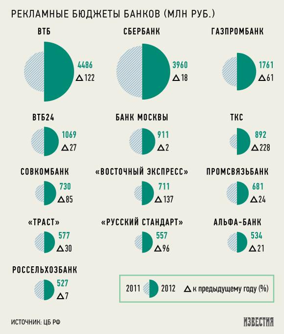 Лидерами по рекламным расходам традиционно оказались банки с госучастием. Так, рекламный бюджет Сбербанка в 2012 году составил 3,96 млрд рублей и ВТБ — 4,5 млрд. За ними идут Газпромбанк — 1,8 млрд и ВТБ24 — 1,1 млрд. Из частных банков больше остальных на рекламу тратились ТКС-банк — 892 млн рублей, Совкомбанк — 730 млн и Промсвязьбанк — 681 млн.