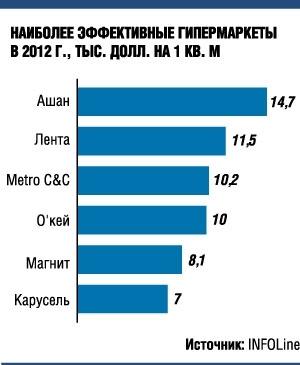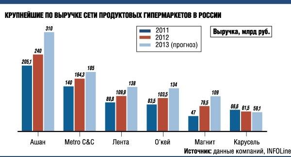 По данным рейтинга INFOLine, по итогом прошлого года в сегменте продуктовых гипермаркетов первое место занимает «Ашан» с выручкой 240 млрд руб. и 57 магазинами. К 2015 году компания собирается довести их количество в России до 100.