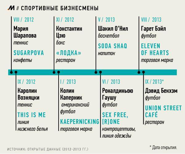 Соперницы Шараповой по корту в бизнесе в основном посвящают себя дизайну. Винус Уильямс владеет компанией по дизайну интерьеров V Starr Interiors и брендом спортивной одежды EleVen, Серена Уильямс выпускает одежду под торговой маркой Aneres и аксессуары Signature Statement. Датская теннисистка польского происхождения Каролин Возняцки в марте 2013-го объявила о запуске линии нижнего белья This is me. Теннисисты-мужчины отдают предпочтение ресторанному и гостиничному бизнесу. В феврале третья ракетка мира Энди Маррей приобрел отель в Шотландии. В 2012-м бельгийский теннисист Кристоф Влиген открыл тапас-бар в городе Ласне. Собственный ресторан в Минске есть у белорусского спортсмена Максима Мирного. А серб Новак Джокович владеет уже тремя точками общепита.