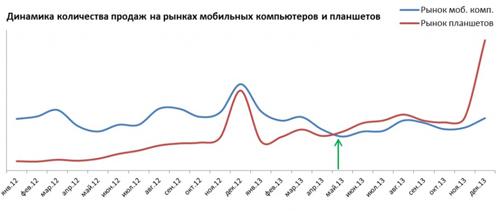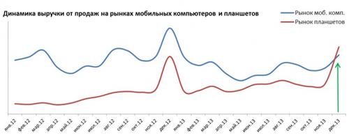 года, в деньгах – в декабре 2013 года. Отставание рынка планшетов в денежном