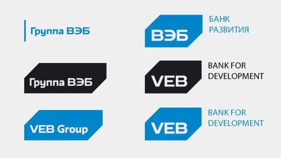 Новый логотип группы ВЭБ представляет собой прямоугольник голубого цвета, напоминающий фундамент здания, на фронтальной грани которого располагается надпись. У ВЭБа несколько вариантов надписей на русском языке и аналогичных на английском: ВЭБ (VEB), Группа ВЭБ (VEB Group), ВЭБ Банк развития (VEB Bank for Development).