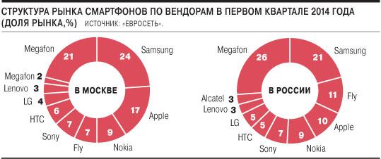 На первое место среди производителей в денежном выражении вышла Apple с долей 40% против 23% у Samsung. Еще годом ранее Samsung сохраняла лидерство с 32% против 31% у Apple. Южнокорейский производитель пока лидирует в количественном выражении с 24% проданных в первом квартале смартфонов против 17% у Apple. На российском рынке Apple с 10% проданных смартфонов в первом квартале была лишь на третьем месте после Samsung с 24% и Fly c 11%.