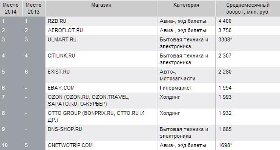 В исследовании Internet Retailer не учитывались продавцы из России. По данным журнала «Коммерсантъ Секрет Фирмы», ТОП-100 крупнейших интернет-магазинов нашей страны возглавляет сайт «Российских железных дорог» (Rzd.ru), чей среднемесячный оборот оценивается в 4,4 млрд рублей против 3,8 млрд рублей годом ранее.