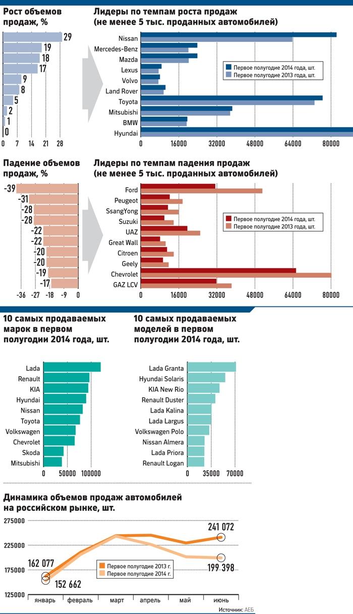 Продажи легковых автомобилей и легкого коммерческого транспорта в России за первое полугодие упали на 7,6% по сравнению с тем же периодом прошлого года, свидетельствует опубликованная вчера статистика Ассоциации европейского бизнеса (АЕБ). Лидер падения полугодия — Ford, ждет новых моделей 2015 года. GM экономит на офисных расходах. А Volkswagen, если продажи не пойдут в рост, сократит спонсорские мероприятия и бюджет на рекламу