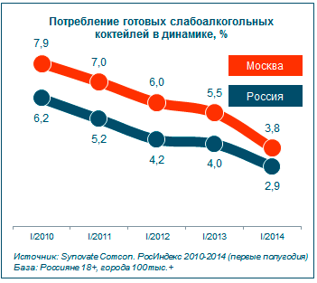 Вместе с энергетиками теряют потребителей и слабоалкогольные коктейли. С 2010 года их употребление в России снизилось на 3,3%, в Москве – на 4,1%. Однако в столице до сих пор коктейли покупают чаще, чем в целом по стране.