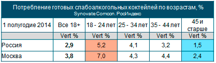 Основными потребителями слабоалкогольных коктейлей также является категория граждан от 18 до 24 лет. Реже всего их пьют люди в возрасте старше 45 лет.