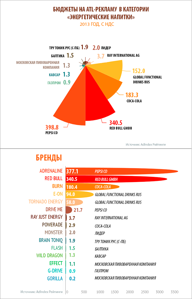Согласно AdIndex Data Center, в 2013 году рекламный бюджет всей категории энергетических напитков составил 1,087 млрд рублей. Больше всего потратили на рекламу такие бренды, как Adrenaline (377,1 млн рублей), Red Bull (340,5 млн рублей) и Burn (180,4 млн рублей).