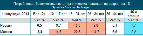 По данным регулярного исследования РосИндекс компании Synovate Comcon, основными потребителями безалкогольных энергетических напитков сегодня в России являются молодые люди от 18 до 24 лет (15,5% от общего числа) и от 25 до 34 лет (9,8%). В Москве доля потребителей безалкогольных энергетиков немного больше, чем в целом по стране, и возрастные границы чуть шире – от 10 до 34 лет, где почти 15% приходится на аудиторию от 10 до 17 лет.