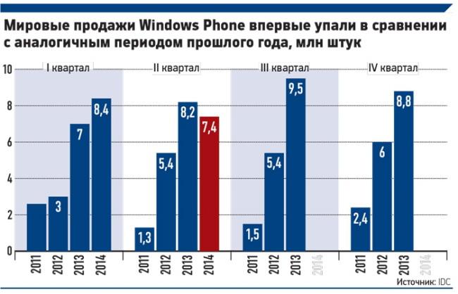 Несмотря на огромные затраты, Microsoft никак не удается раскрутить свою операционную систему для смартфонов. По данным IDC, поставки смартфонов с Windows Phone упали: во всем мире за второй квартал они составили 7,4 млн — на 10% меньше, чем за тот же период прошлого года. Это первое падение с 2012 года, когда Nokia начала выпускать смартфоны с Windows
