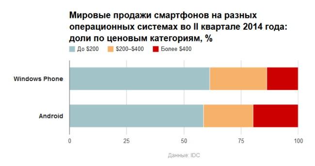 Раньше эксперты говорили, что Windows Phone для захвата массового рынка смартфонов не хватает дешевых моделей, благодаря которым вперед вырывается Android. Из данных IDC следует, что теперь это не так: за второй квартал в продажах Windows Phone доля смартфонов дешевле $200 была самой высокой — 61,4%, это даже больше, чем у Android c 58,7%.