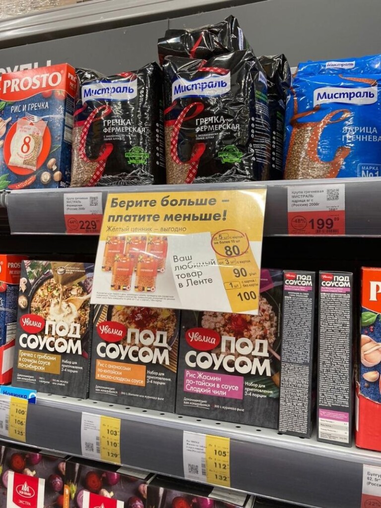 На «многоуровневых» ценниках указаны цена по карте лояльности, без нее ицена при покупке нескольких единиц. Чем больше штук, тем выше скидка на товары,которые не участвуют в акции.