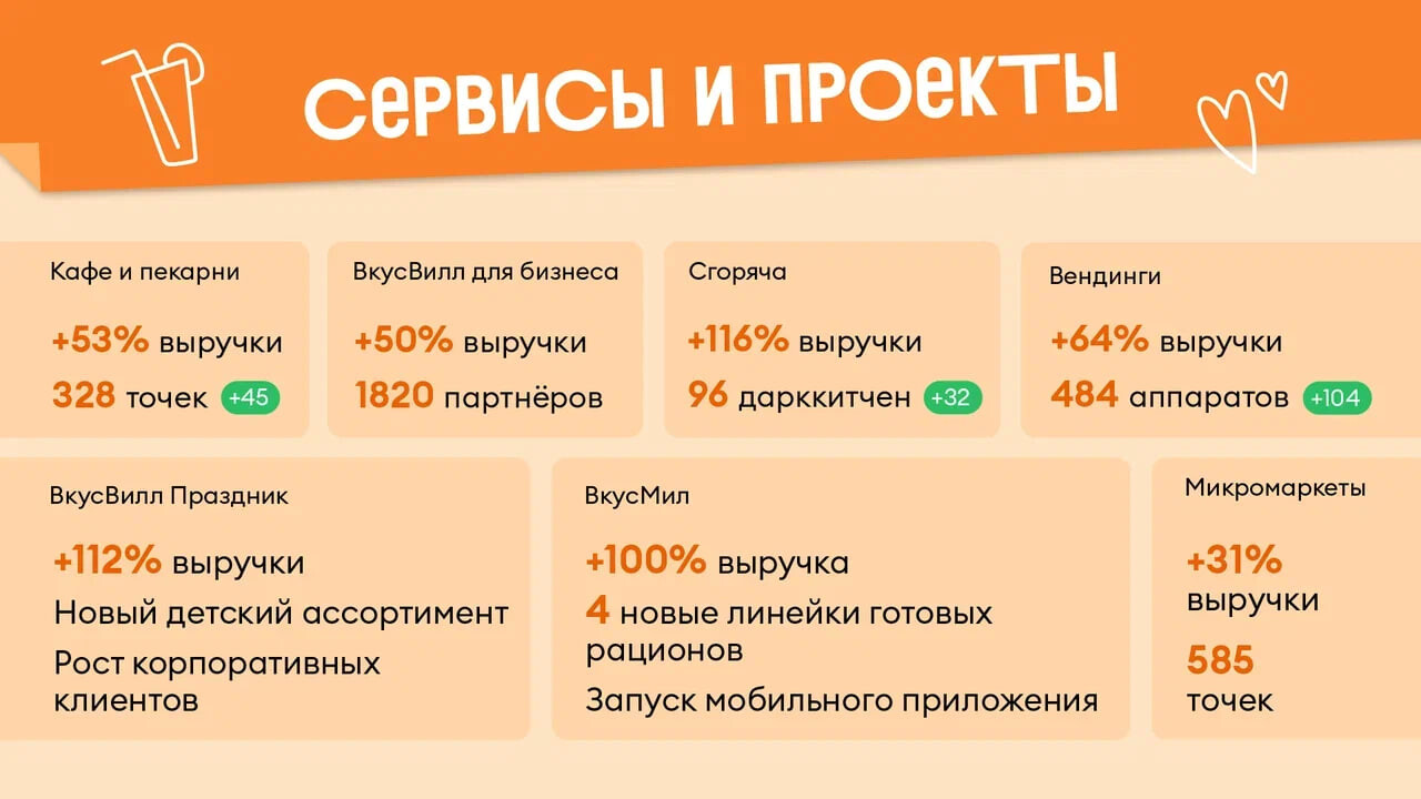 За 2023 г. «ВкусВилл» открыл 531 новый магазин и 28 дарксторов — темпыразвития выросли в пять раз по сравнению с 2022 г. В прошлом году у сетипоявились первые мини-магазины (формат магазина небольшой площади в доме) игрейсторы (магазин, совмещенный с отдельной зоной сборки онлайн-заказов).