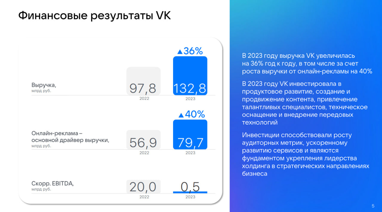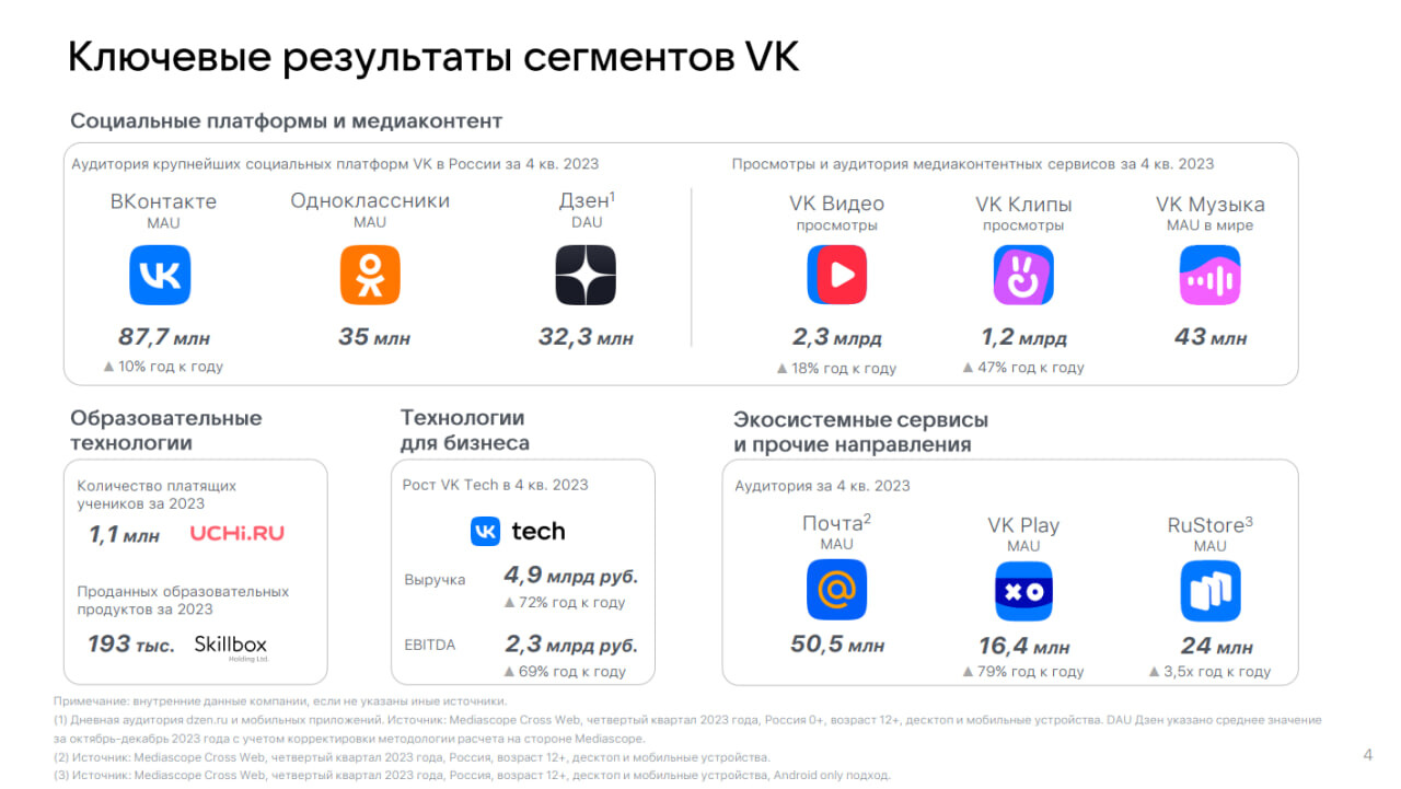 «В 2023 г. VK инвестировала в продуктовое развитие, создание ипродвижение контента, привлечение талантливых специалистов, техническоеоснащение и внедрение передовых технологий. Инвестиции способствовали ростуаудиторных метрик, ускоренному развитию сервисов, и являются фундаментомукрепления лидерства холдинга в стратегических направлениях бизнеса», —сообщили в пресс-службе компании.
