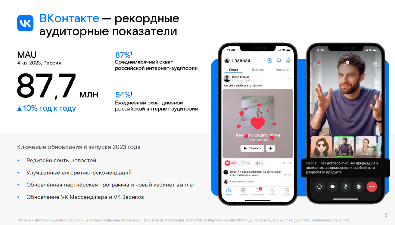 Рост выручки соцсети «ВКонтакте» составил 23%. Выручка сегмента включаетдоход от проектов «Дзен» и «Новости». В 2023 г. скорректированная EBITDAкатегории составила 7,5 млрд руб. Средняя дневная аудитория «ВКонтакте» вырослана 10% — до 54,1 млн пользователей. Ранее также сообщалось, что авторы во«ВКонтакте» в 2023 г.заработали 5,5 млрд руб. — на 37% больше, чем годомранее.