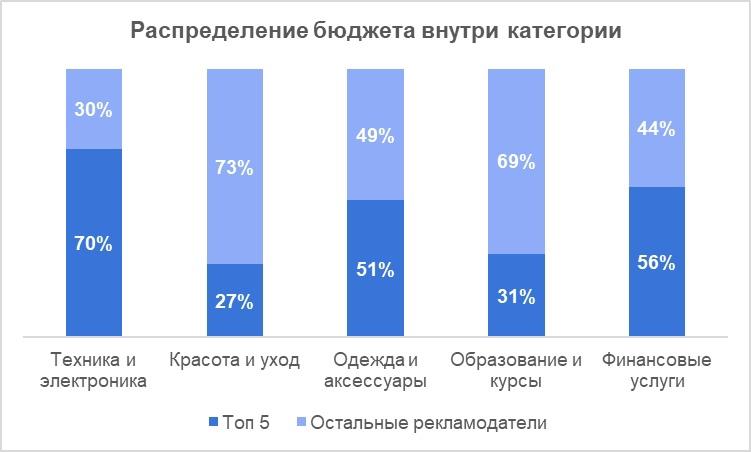 В тематиках «Красота и уход», «Образование и курсы» рынок выглядит менееконсолидированным, на крупнейших рекламодателей приходится порядка третисуммарного бюджета.