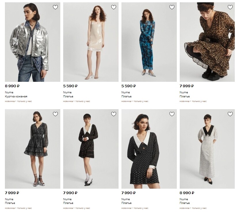 В продаже уже появились около 90 предметов — платья, юбки, брюки, блузки,жакеты и другие товары. В ближайшее время на платформе также будет доступнаподборка одежды Nume из денима. Всего в этом сезоне в продажу поступит более300 различных моделей, в том числе обувь.
