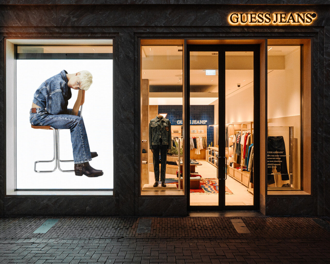 «В основе продукции Guess Jeans лежит технология обработки ткани — GuessAirwash: современная экологичная альтернатива стирке с камнями, которую Guessпридумал в 1981 г.», — сказали в компании.