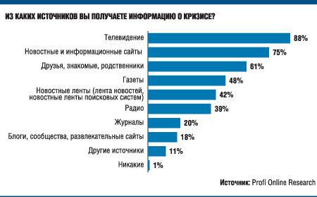 Исследование подтвердило, что телевидение остается наиболее мощным инструментом коммуникации — около 88% опрошенных черпают основную массу информации о кризисе с экранов телевизоров. О положении дел через Интернет узнают порядка 75% участников исследования. Аналитики, проводившие опрос, отметили, что большое влияние на осведомленность россиян о кризисе оказывает устная форма передачи информации. Почти две трети респондентов отметили, что узнают многое из рассказов своих друзей, родственников и знакомых. Президент холдинга «Ромир» Андрей Милехин полагает, что неверно ставить такие источники информации, как телевидение и мнения друзей и знакомых, в один ряд. «Мне кажется, подобная классификация не совсем корректна, — говорит он. — Дело в том, что люди привыкли к тому, что говорят СМИ о кризисе, и стали относиться к получаемой из них информации более критично. То, что мы получаем посредством сарафанного радио, для нас гораздо важнее. Когда мы узнаем, что кого-то из наших знакомых кризис коснулся непосредственным образом, мы понимаем, что он — не абстрактное явление».