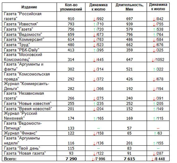 В августе газета «Газета» сохранила свое место в топ-3, уступив лишь «Российской газете» и газете «Известия». Также интересно появление в топ-20 таких изданий, как «Ведомости-Пятница» (упоминались 133 раз) и газеты «Твой день» (упоминалась 115 раз). На фоне появления новых участников топ-20 из данного списка в августе выбыл журнал «Эксперт», традиционно являвшийся одним из наиболее часто упоминавшихся журналов, и издание «Русский репортер».
