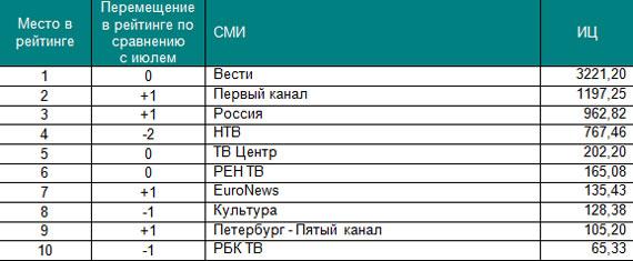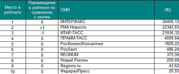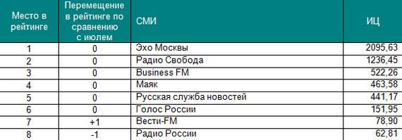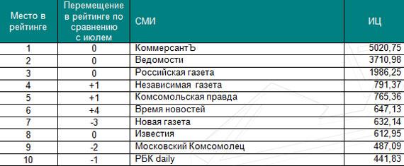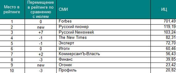 Первые строчки рейтингов не изменились по сравнению с предыдущим периодом. Лидирующие позиции в соответствующих сегментах по-прежнему занимают: телеканал Вести, газета КоммерсантЪ, журнал Forbes, агентство Интерфакс и радиостанция Эхо Москвы. На других позициях произошел ряд перемещений. Самые существенные перемещения произошли в сегменте журналов: вторую позицию занял Русский пионер благодаря активному обсуждению в СМИ публикации романа «Околоноля», на 7 пунктов улучшил свои позиции Русский Newsweek, который опубликовал интервью с бывшим главой НК 'ЮКОС' Михаилом Ходорковским. Среди газет следует отметить Время новостей, издание продвинулось на 4 пункта за счет публикаций о президенте Ингушетии Юнус-Беке Евкурове. В топ-10 вошли СМИ, не попавшие в июльский рейтинг: Огонек и Русский пионер. Основой для построения рейтинга самых цитируемых российских СМИ стал Индекс Цитируемости (ИЦ) «Медиалогии».* Рейтинг построен на основе базы СМИ системы «Медиалогия», которая включает на данный момент 3 903 наиболее влиятельных источников РФ: ТВ, радио, газеты, журналы, информационные агентства, Интернет-СМИ и блоги. В данный рейтинг вошли российские СМИ федерального уровня, специализированные СМИ при подсчете не учитывались. Период исследования – с 1 августа по 31 августа 2009 года.