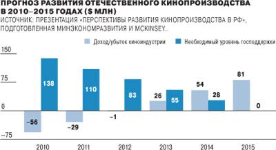 Но уже в 2013 году кинопроизводство может принести продюсерам прибыль в размере $26 млн при господдержке $55 млн, а в 2015-м отрасль вообще сможет обойтись без государственных дотаций, получив $81 млн прибыли, полагают в министерстве (см. диаграмму). Для этого помимо $400-450 млн господдержки в 2010-2014 годах необходимо реализовать целый комплекс мер.