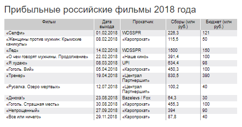 Среди фильмов, вышедших в 2018 г., наибольшие доходы продюсерам принесла спортивная драма «Лед». Ее бюджет, по данным Kinodata.pro, составил 150 млн руб., а сборы — 1,5 млрд руб. Сборы спортивной драмы «Тренер» превысили бюджет на 440 млн руб., а триллера «Гоголь. Страшная месть» и драмы «Непрощенный» — примерно на 300 млн руб.