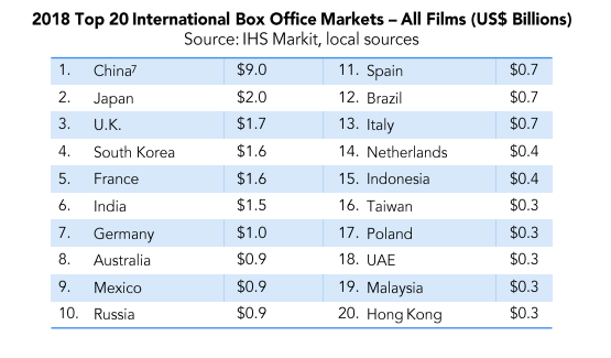 В список крупнейших рынков по продажам кинотеатров также попали Китай ($9 млрд), Япония ($2 млрд), Великобритания ($1,7 млрд) и Южная Корея ($1,6 млрд).