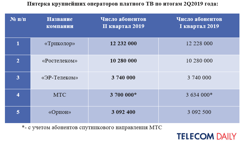 Прирост в абонентской базе продемонстрировали только спутниковый оператор «Триколор», подключивший 4 тыс. новых абонентов (вся база — 12,23 млн), и МТС, увеличившая базу на 66 тыс. пользователей (до 3,7 млн). «Ростелеком» впервые закончил квартал с неизменным показателем абонентской базы (10,28 млн), такая же ситуация у «ЭР-Телекома» (3,74 млн); «Орион» (3,09 млн) продолжил показывать незначительный отток.