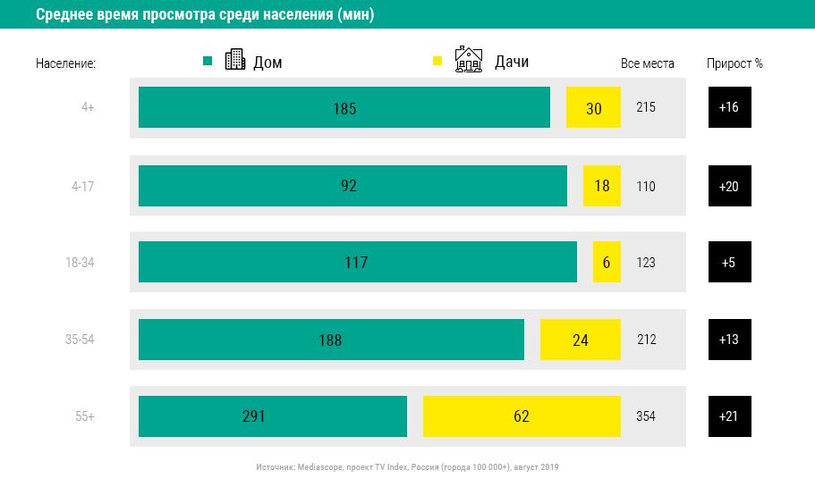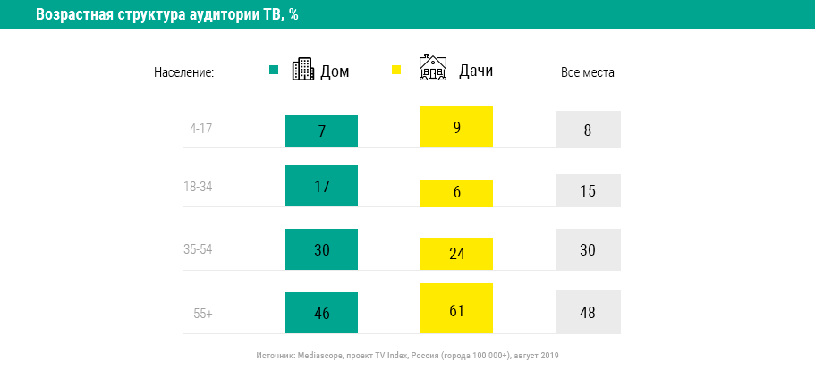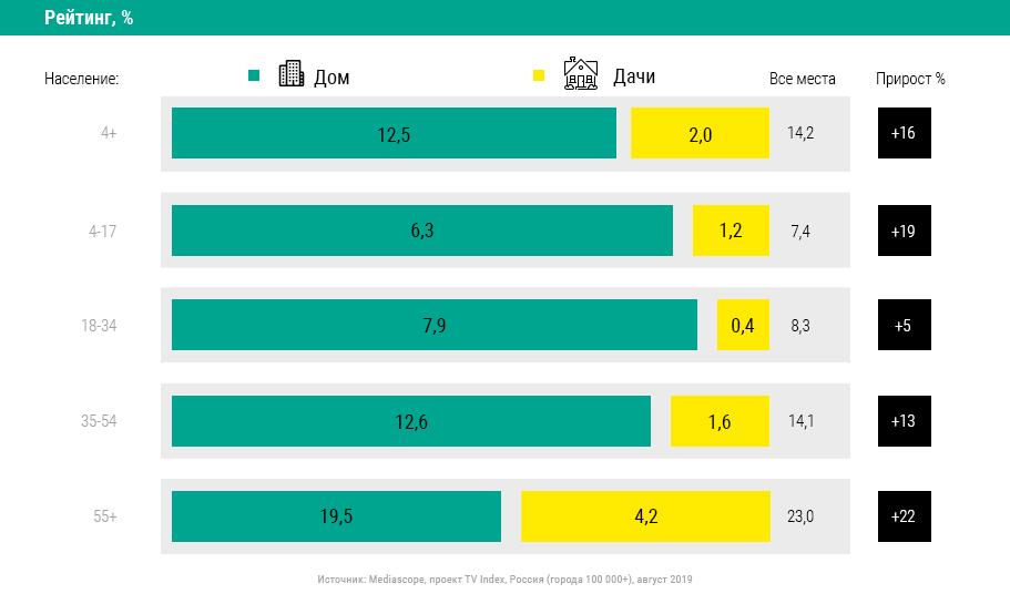 По данным медиаизмерителя, в августе 2019 г. ТВ на даче смотрело 2% населения старше 4 лет, что прибавляет к домашнему телепросмотру 16% аудитории. Самый высокий рейтинг на дачах зафиксирован в возрастных категориях 55+ и 35–54 лет: 4,2% и 1,6% соответственно. Это обеспечило прирост к общему телерейтингу (Total TVR) в этих группах на 22% и 13% соответственно. Дачное телесмотрение также характерно для детской и подростковой аудитории 4–17 лет: рейтинг 1,2%, прирост к общему телерейтингу на 19%. Менее активно ТВ на дачах смотрит аудитория в возрасте 18–34 лет (рейтинг 0,4%, +5% к домашнему телепросмотру).