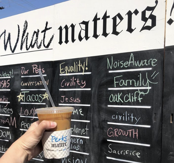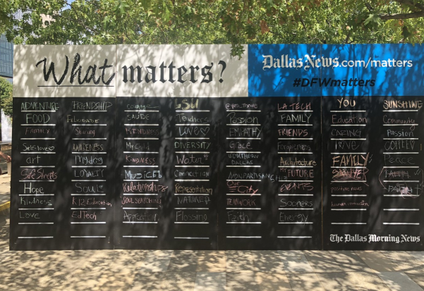 И сделать это было решено несколькими способами. Во-первых, по всему городу были установлены фургоны с бесплатными кофе и газетами The Dallas Morning News. На стаканчиках каждый мог написать свое мнение под фразой «Что действительно важно». Также в парках и других общественных местах были размещены большие грифельные доски, на которых прохожие могли мелом записать свой ответ на этот вопрос. Все они были потом собраны и стали частью кампании — были размещены на рекламных баннерах на улицах, общественном транспорте и пр.