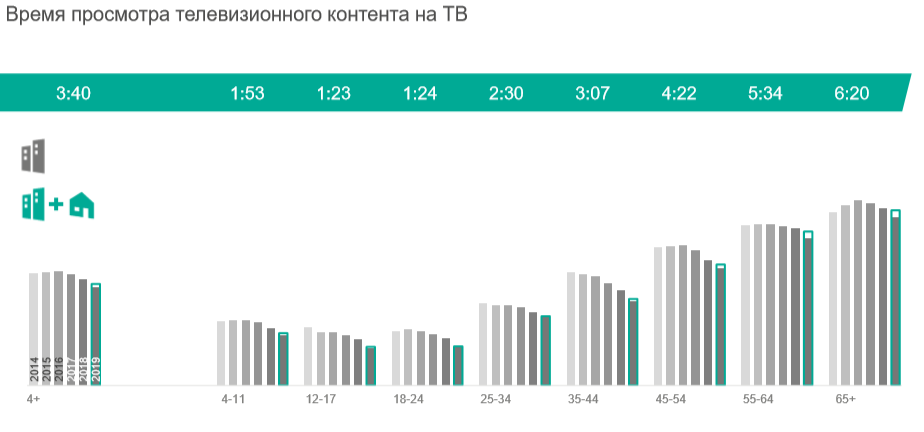Относительно 2018 г. показатель снизился на 17 минут — с 3 часов 50 минут. В 2017 г. среднее время телесмотрения было на уровне 4 часа 2 минуты в сутки.