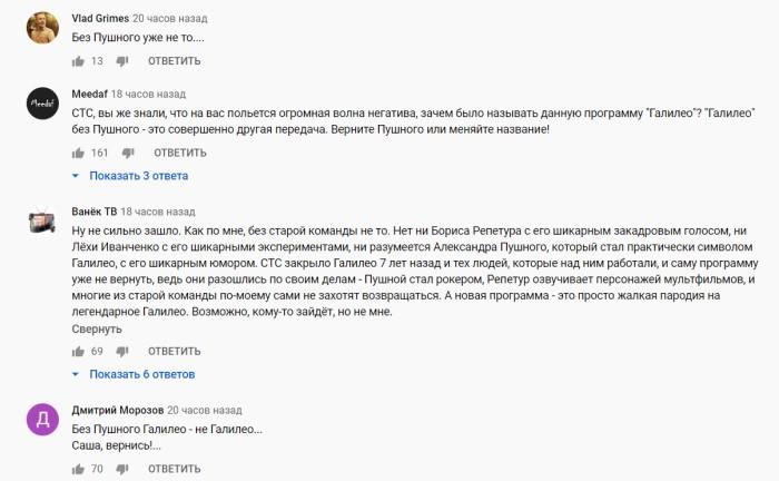 Общий мотив комментариев под видео — верните Пушного и прежний закадровый голос (ранее сюжеты «Галилео» озвучивал актер Борис Репетур). Пользователи отмечают, что новый голос звучит слишком мрачно и серьезно и не соответствует формату.