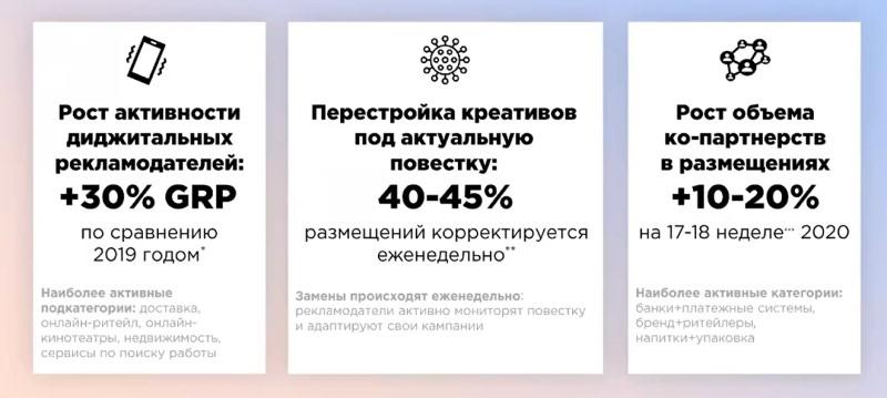 Толстоган также сообщил о росте активности диджитальных рекламодателей: у данной категории прирост GRP по сравнению с 2019 г. составил 30% (период 20 марта — 10 мая). В первую очередь речь идет о доставке, онлайн-ритейле, OTT-платформах, недвижимости и сервисах для поиска работы. Кроме того, бренды постоянно следят за повесткой и адаптируют свои кампании: 40–45% размещений корректируется еженедельно.