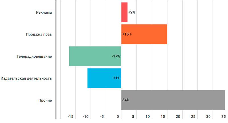 Доходы компании от двух других сегментов заметно сократились. Выручка от телерадиовещания упала на 17% — до 1,3 млрд руб., от издательской деятельности — на 11%, до 201 млн руб. Прочие доходы составили 1,6 млрд руб. против 1,2 млрд руб. годом ранее.