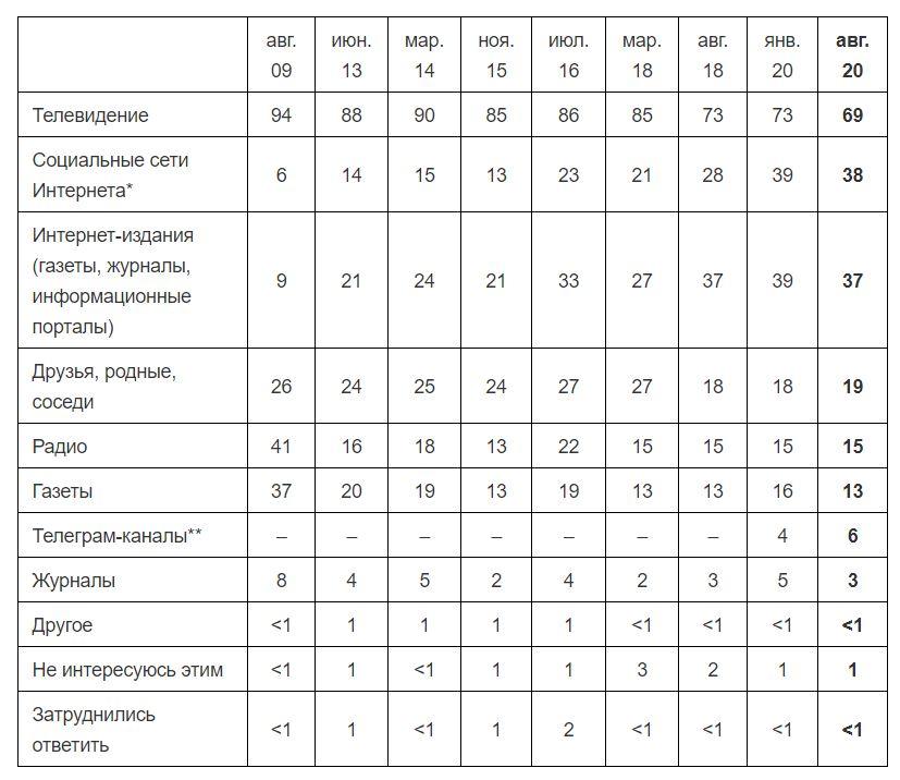 За пять лет доверие к «сарафанному» радио (друзьям, родным, соседям) снизилось с 19 до 11%, к газетам — с 12 до 10%, к радио — с 11 до 10%. Telegram-каналы, которые появились в анкете в начале 2020 г., стремительно набирают очки: 4% в январе и 7% в августе. Доля тех, кто не доверяет ни одному источнику, увеличилась вдвое — с 8 до 16%.