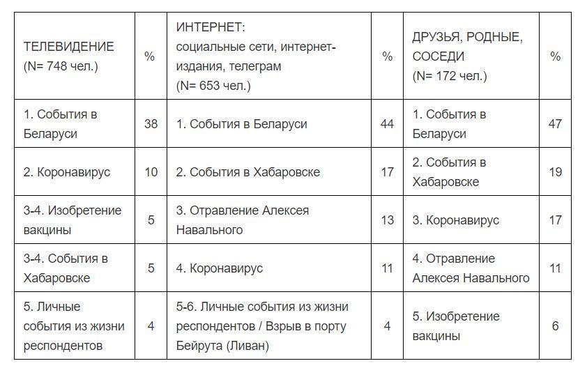 В августе 2020 г. в первой пятерке событий среди россиян, доверяющих теленовостям, не оказалось новостей, связанных с отравлением Алексея Навального; коронавирус и изобретение вакцины запомнились зрителям больше, чем протесты в Хабаровске. Напротив, среди доверяющих интернет-источникам эти события назывались значительно чаще.
