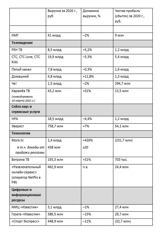 «Национальная Медиа Группа» завершила 2020 г. с выручкой в 41 млрд руб., чтона 2% ниже по сравнению с 2019 г. Снижение доходов медиахолдинг объясняетреакцией рынков на пандемию COVID-19.