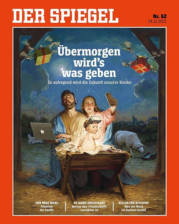 Один из крупнейших политических журналов Германии Der Spiegel выпустилпрактически программную обложку под занавес 2021 года. Она иллюстрируетвступительную статью главного редактора издания — Ульриха Фихтнера.Журналист задается вопросом, какое будущее ждет детей, которые родились вминувшем году— на фоне пандемии, войн и на пороге климатических кризисов. Авторс оптимизмом смотрит в будущее, но напоминает, что у человечества остаетсямного неразрешенных задач.