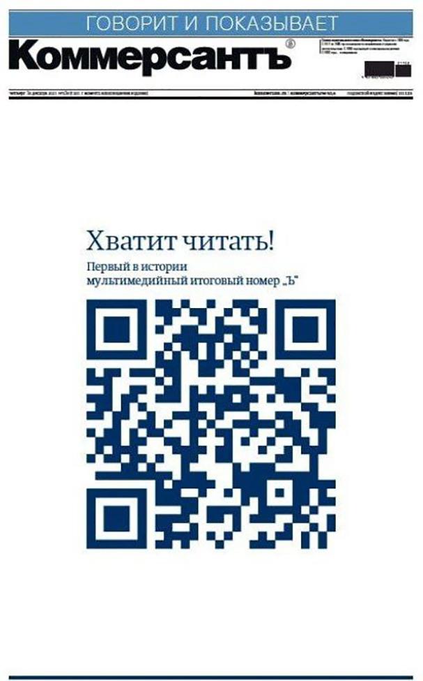 Итоговый номер «Коммерсанта» — это одновременно дань разрастающейсяdigital-вселенной и ставшими уже привычными пандемии и сертификатам. Вдекабрьском выпуске не осталось места для слов — все статьи превратились вQR-коды, которые направляют читателей на материалы сайта. Код на обложкеотсылает к архивной видеонарезке кадров с посетителями кабаре, печатнымимашинками и телеграфами. «Коммерсантъ» напоминает, с чего начиналась привычнаядля нас пресса и к чему мы приходим сейчас.