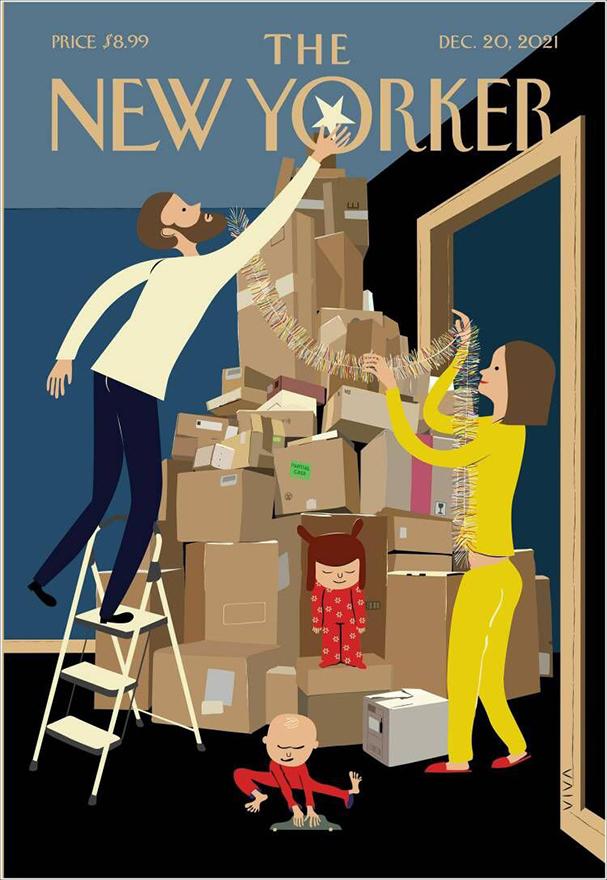 The New Yorker поместил на свою обложку счастливое семейство, котороенаряжает рождественскую «елку» из использованных упаковочных коробок.ESG-повестка налицо, как и напоминание о меняющихся общественныхнормах.