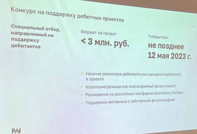 Сейчас ИРИ проводит конкурс на поддержку дебютных проектов с бюджетом около3 млн руб. Победителей объявят не позднее 12 мая 2023 г., среди требований кзаявкам — размещение проекта во «ВКонтакте» и на Rutube, наличиережиссера-дебютанта или сценариста-дебютанта на проекте, короткометражный илимногосерийный фильм (пилот), поддержка наставника с собственнойфильмографией.