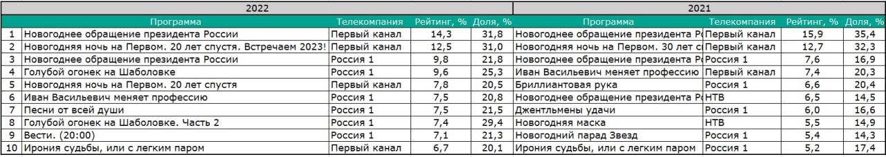 Второе и третье места рейтинга также остались без изменений — эти строчкизаняли «Новогодняя ночь на Первом» и обращение президента России. Изменилисьчетвертое и пятое места: в 2021 г. эти позиции занимали фильмы «Иван Васильевичменяет профессию» и «Бриллиантовая рука», а в 2022 г. их сместили праздничныепрограммы «Голубой огонек на Шаболовке» и «Новогодняя ночь на Первом».
