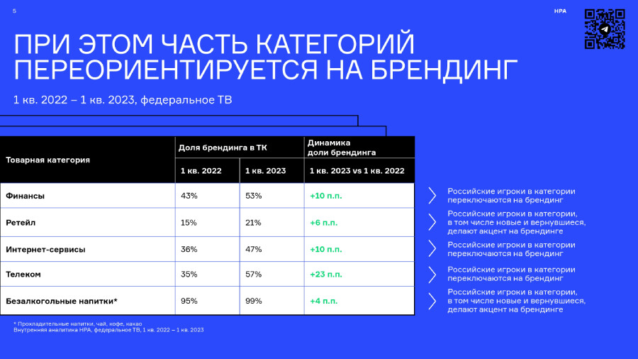 Брендинговую рекламу чаще других закупали компании из категориибезалкогольных напитков (прохладительные напитки, чай, кофе, какао) — на такиекреативы было потрачено 99% бюджетов в сегменте, согласно внутренней аналитикеНРА за первый квартал. Год к году показатель вырос на 4 п. п. Самойбыстрорастущей категорией по этому критерию стал телеком, где доля брендингавыросла к прошлому году на 23 п. п. — до 57%.