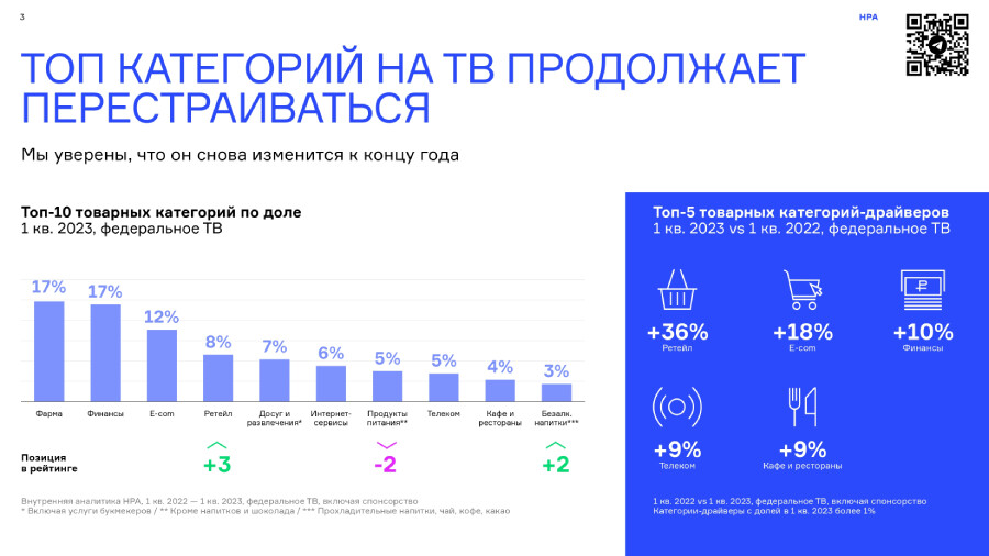 В целом в тройке крупнейших категорий рекламодателей в январе — марте былифарма и финансы (по 17% в общей доле), а также e-com. При этом на 3 п. п.выросля доля ретейла — до 8%, также на 2 п. п. приросли безалгокольные напитки— до 3%. Падение же показала категория продуктов питания, сократившая долю на 2п. п., или до 5%.
